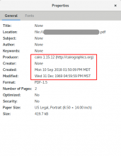 A bogus date (Wed 31Dec 1969 04:59:59 PM MST) appears in the properties of Print-to-PDF files produced by PureBrowser, Thunderbird, and LibreOffice. This might happen in all applications exporting to PDF, but so far this is all I've tested and made screenshots of.